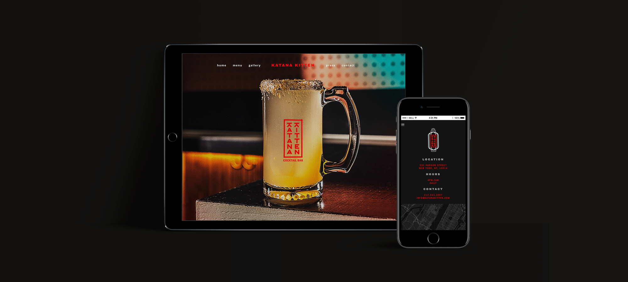 The Katana Kitten brand is always playful and vibrant. The duality of east-meets-west is translated throughout the design. The logo is created by hand-made tape typography. A clean, minimal menu is contrasted against neon acrylic boards. A hodgepodge of graphic styles ties together into the Katana Kitten brand, allowing the brand to continue to evolve and excite.